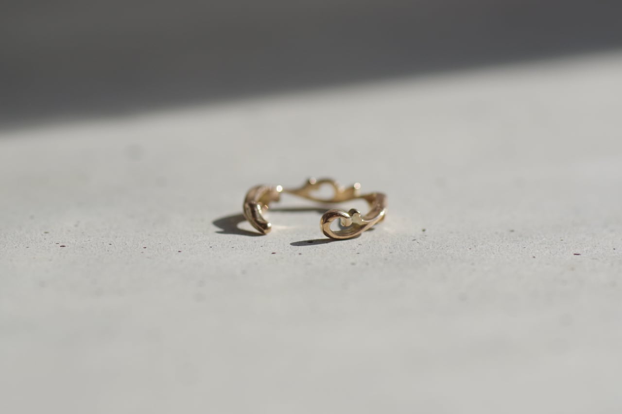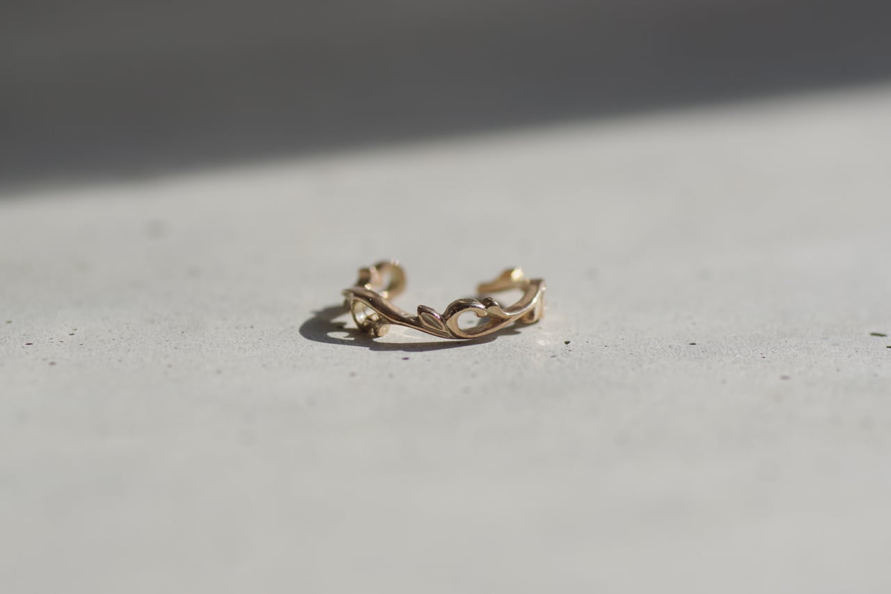 【寸法】およそ幅2.0mm~3.1mm(モチーフ部分)、厚み1.1mm、外径15mm、開口部5.2mm