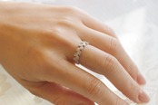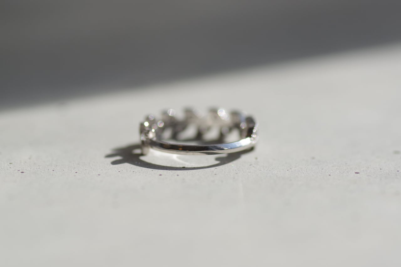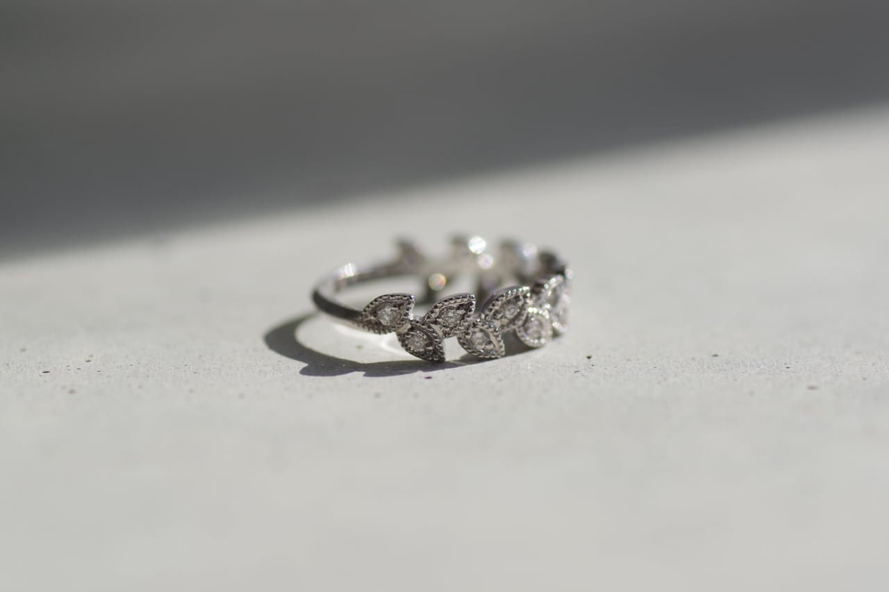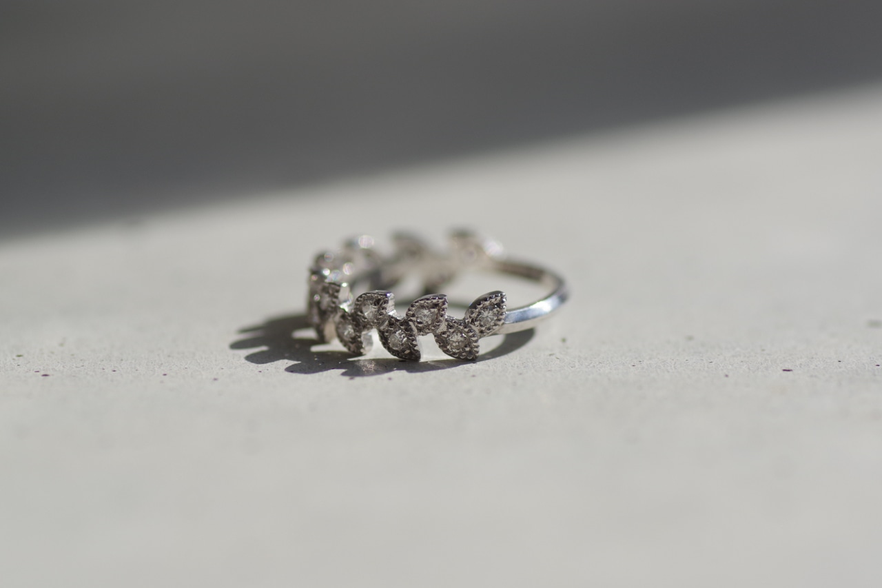 月桂樹の冠をモチーフにしたダイヤモンドを留めたハーフエタニティの指輪です。