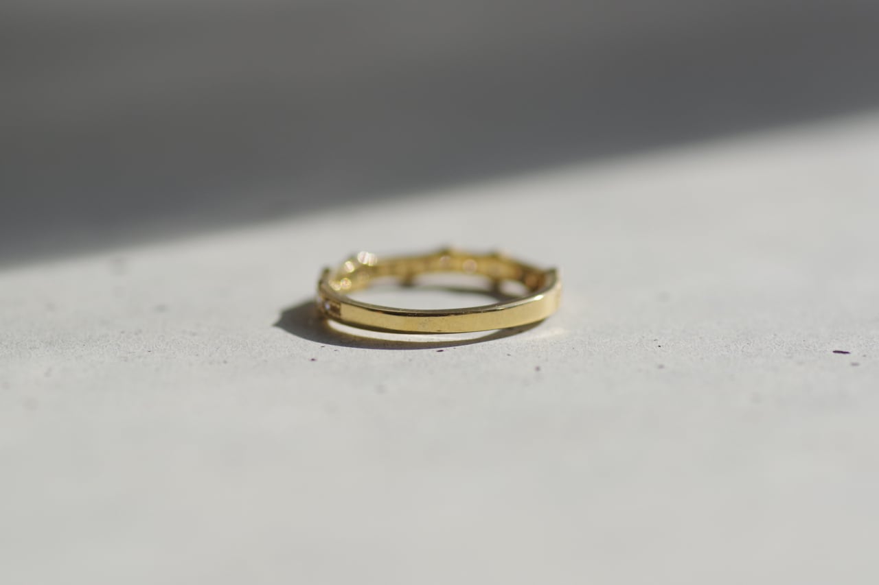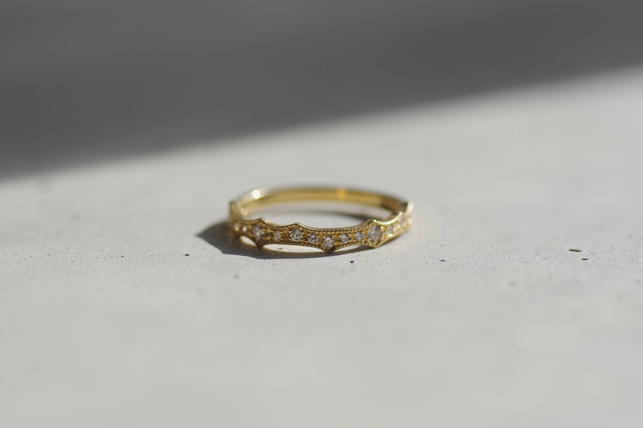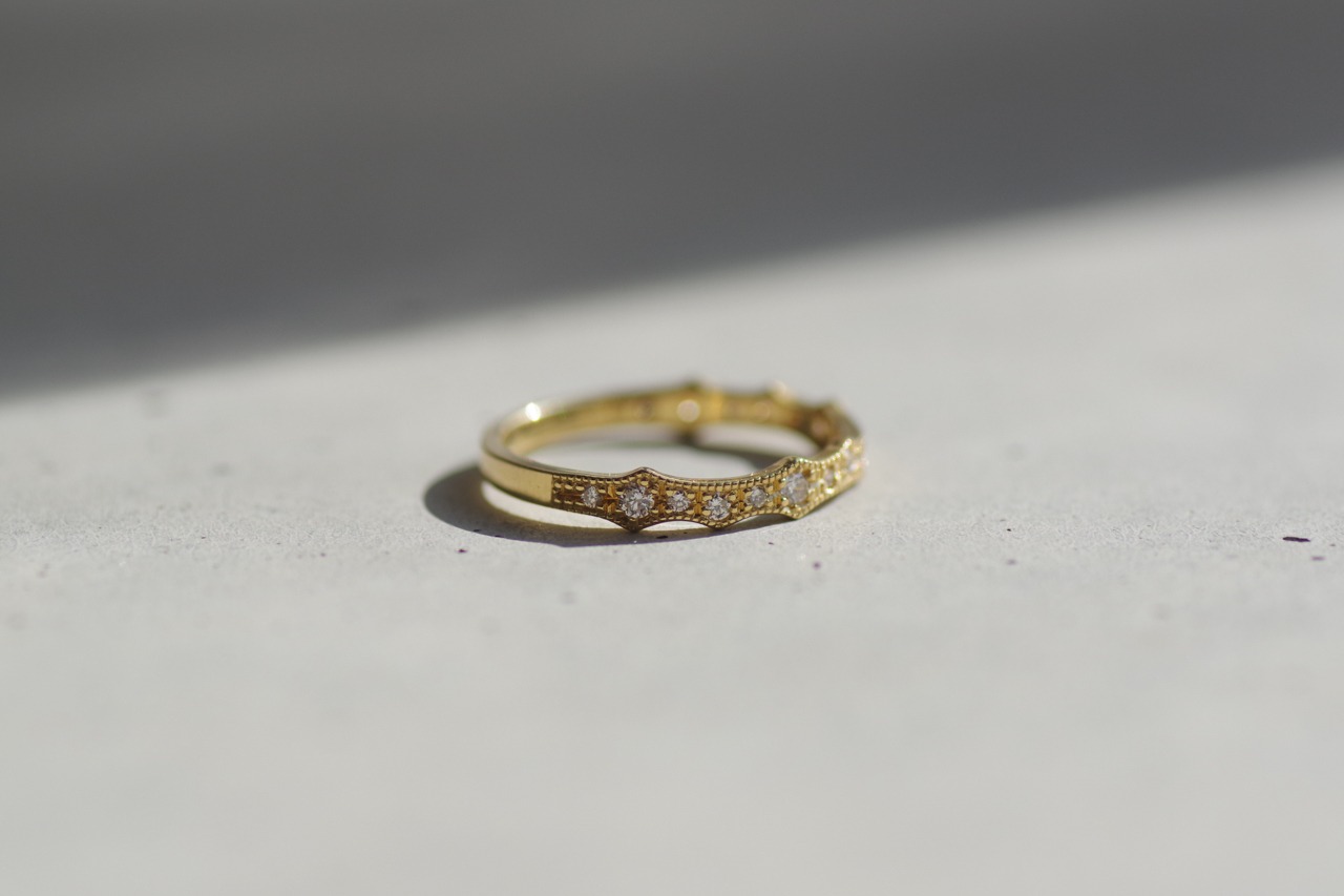 薔薇のトゲをモチーフにしてダイヤモンドを留めたハーフエタニティの指輪です。