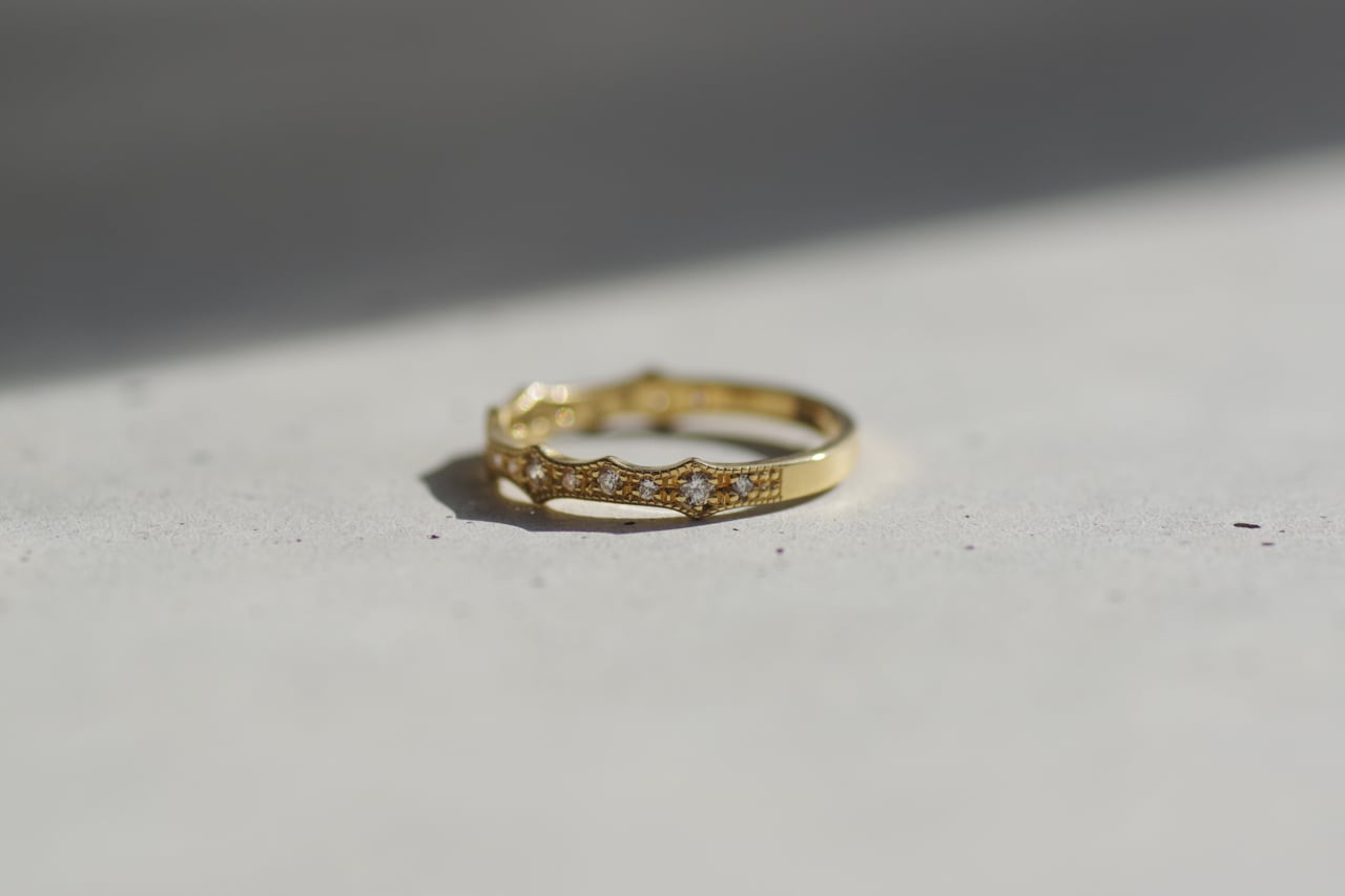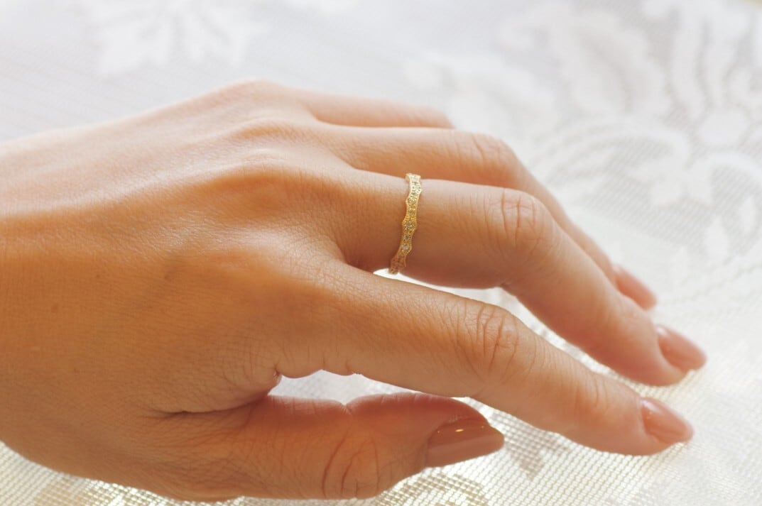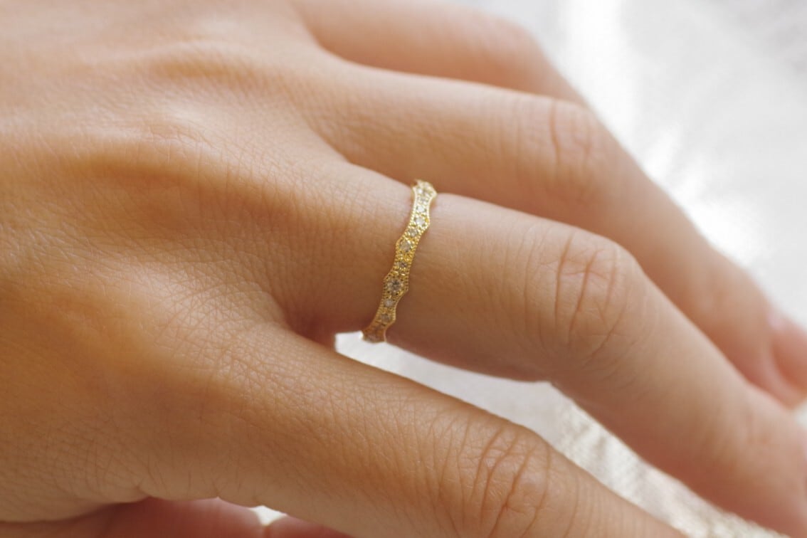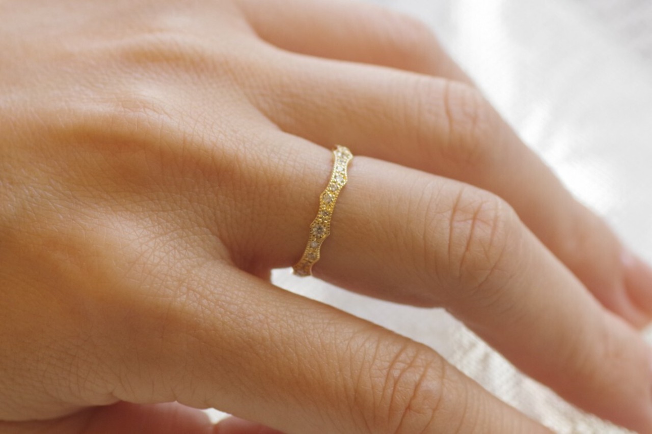 薔薇のトゲをモチーフにしてダイヤモンドを留めたハーフエタニティの指輪です。