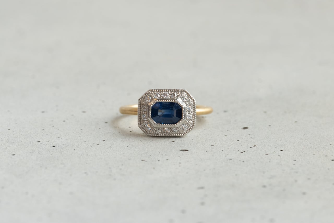 石枠をPt900で制作し、サファイアの周りにダイヤモンドを彫り留めしました。