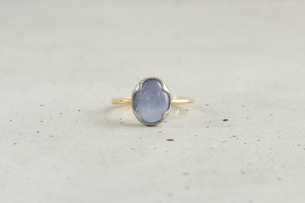 花の萼をモチーフにした石枠で包み込むように石を留めているデザインです。