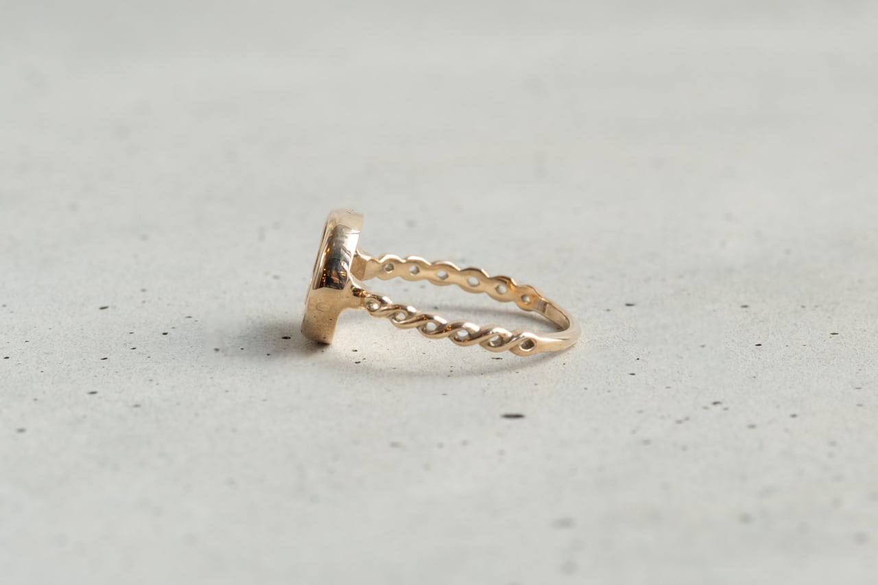 この作品は着用した際指の色が干渉しないよう石の下にプラチナの薄板を敷いています。
