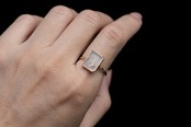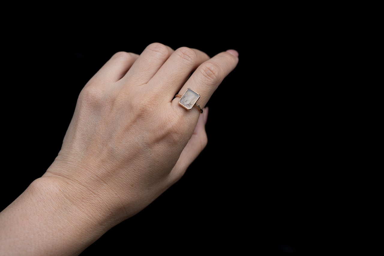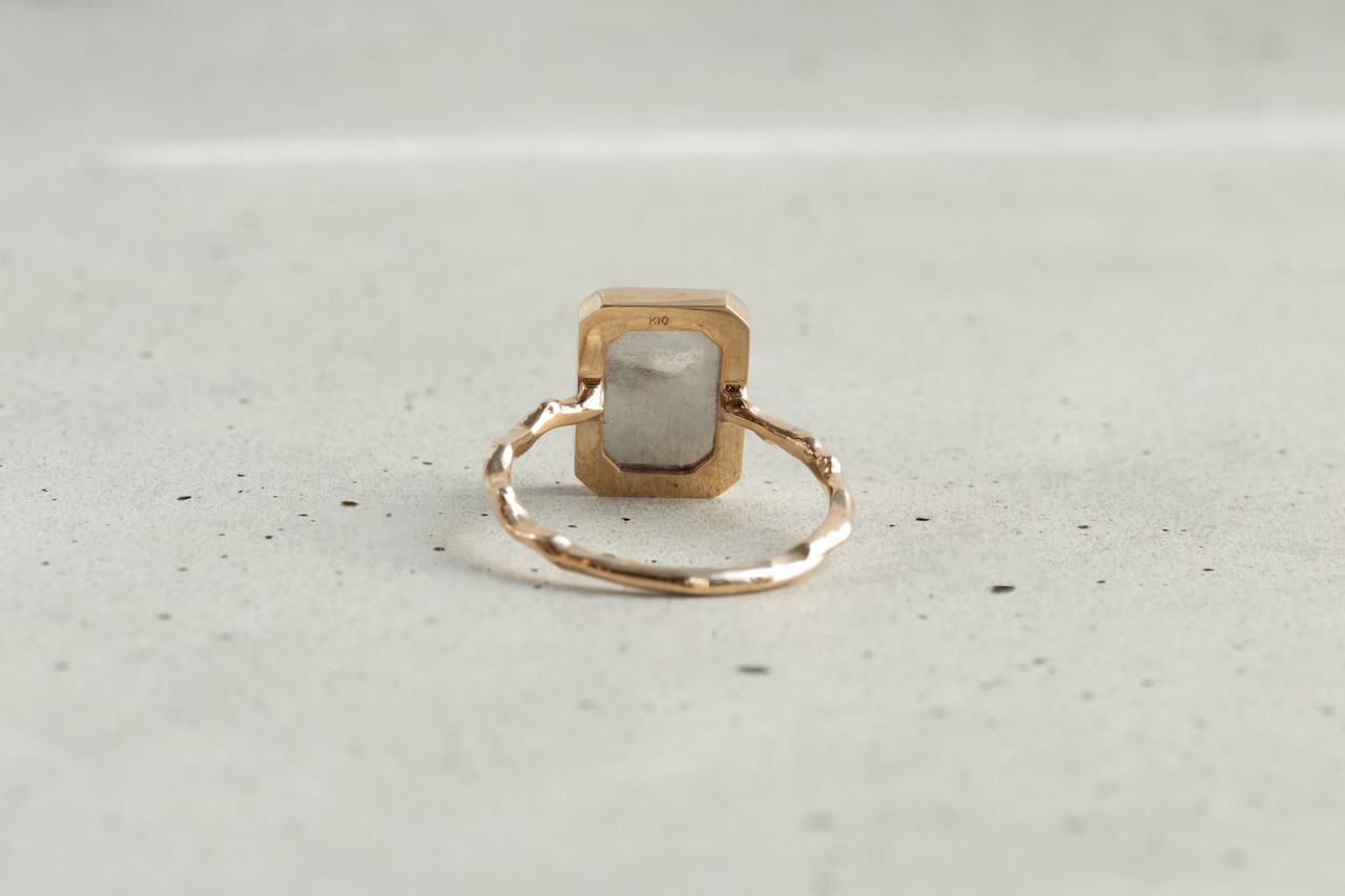 この作品は着用した際指の色が干渉しないよう石の下にプラチナの薄板を敷いています。