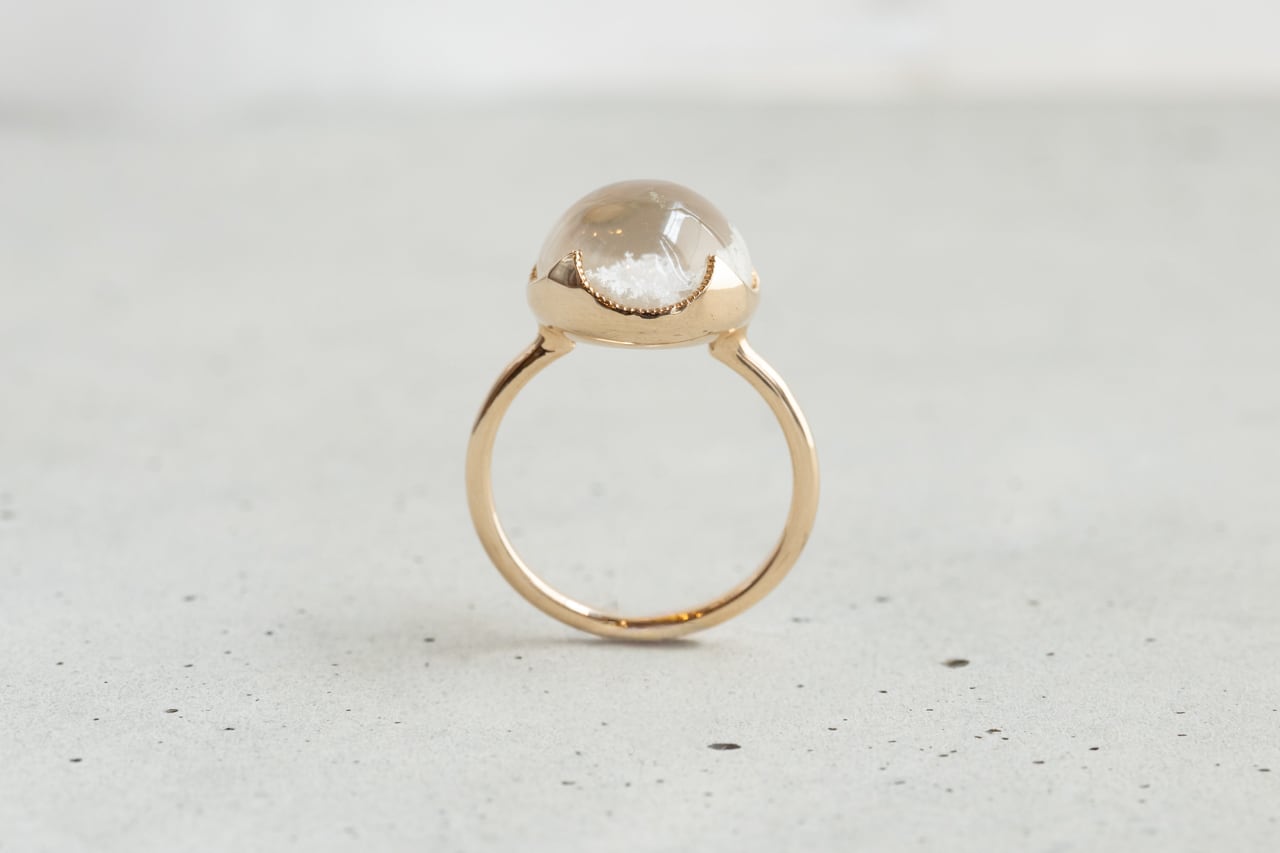 花の萼をモチーフにした石枠で包み込むように石を留めているデザインです。