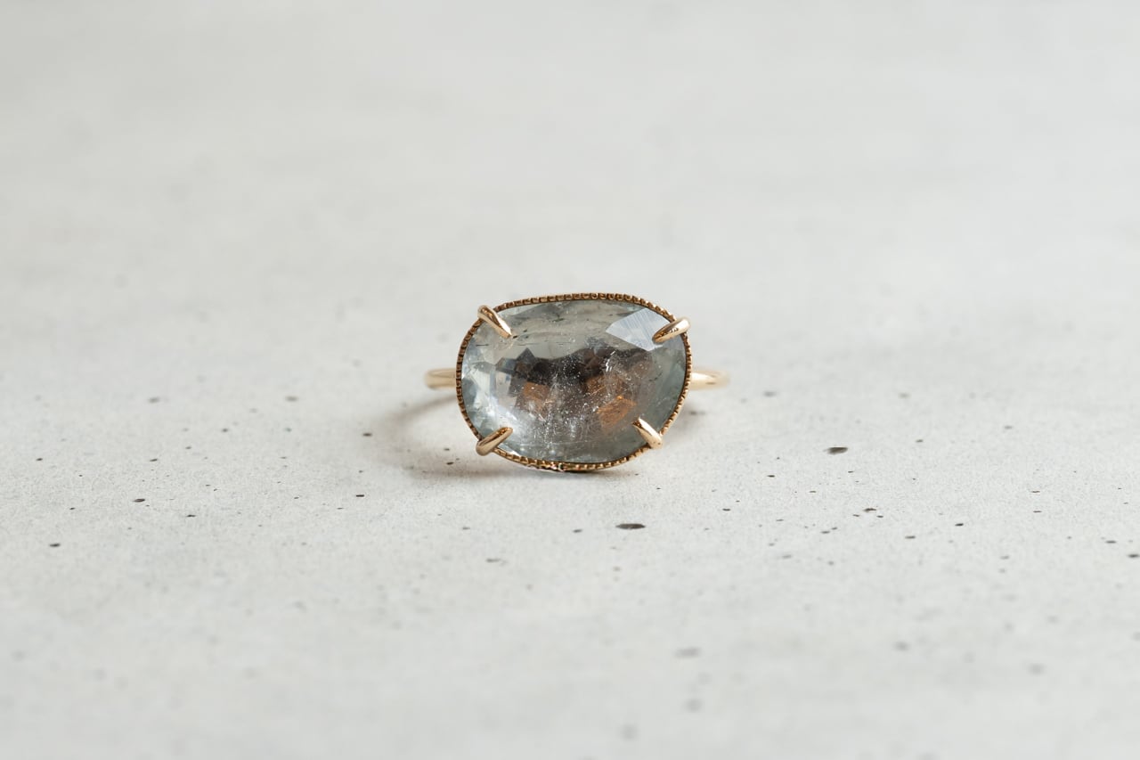 この作品は石の下にプラチナの薄板を敷いているので独特の反射をしています。