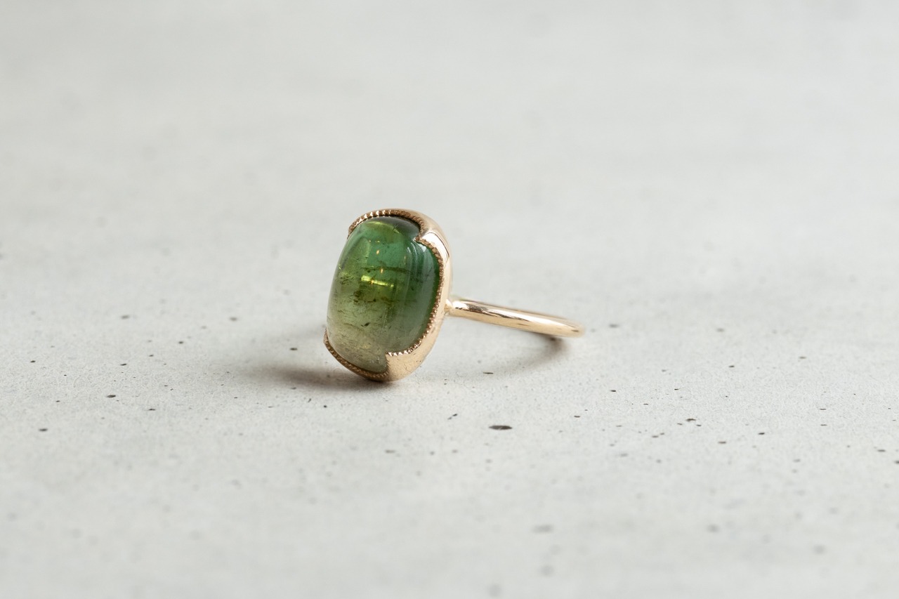 花の萼をモチーフにした石枠で包み込むように石を留めているデザインです。