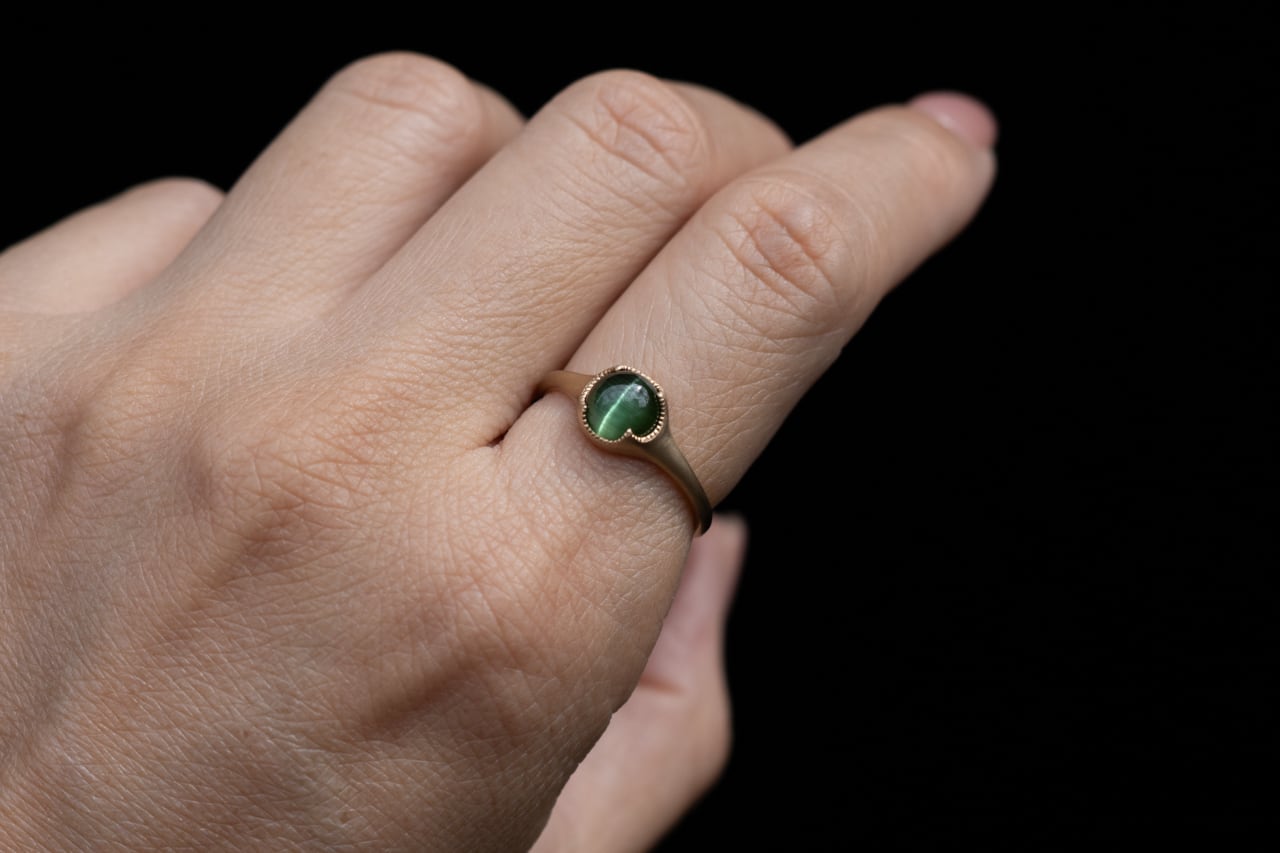 トルマリンキャッツアイは、トルマリンの結晶中に繊維状や針状の包有物が平行に並んでいることで、表面に一条の光の帯(キャッツアイ効果、シャトヤンシー)が現れる石です。